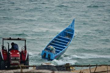 busy little fishing village with lots of red fishing nets being rolled, not much