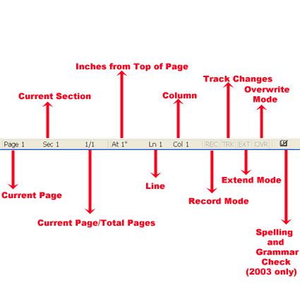The Status bar appears at the very bottom of the screen and provides such information as the current page, current section, total number of pages, inches from the top of the page, current line number, and current column number. The Status bar also provides options that enable you to track changes or turn on the Record mode, the Extension mode, the Overtype mode, and the Spelling and Grammar check. Horizontal and Vertical Scroll Bars