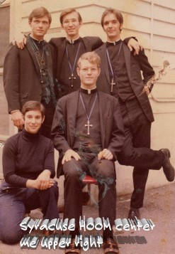 Everyone else was standing about talking but for some reason I went off on to a very strange tangent. The girl and I, and I remember this clearly to this day, began kissing. Not only did we not know each other, never having seen one another before this particular afternoon, but also, I was a brother in a Holy Order at a religious (my invisible mate there on the left in front – now visible)