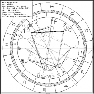 First meeting chart January 26, 1980 When hunger knows what time it is there is not much reason to ask anyone so I went to the dining hall where I found Drew who brought me over to where the Adelaide group was sitting, and there she was – the one who had responded so negatively toward me when I had asked what the time was. The moment was already ingrained into my brain and I remember it now as if the clock had stopped on that moment; 6.15 PM on Saturday, January 26th 1980 when the moon was at 27 degrees Taurus and 48 minutes so close to my own Moon’s placement at 28 Taurus and five minutes. Because my North Node is also at this point, with both in the eighth house I have strange things with women when any celestial body, discovered or not, hovers around 28 degrees of a fixed sign.