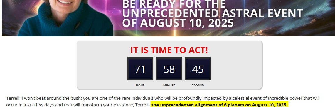 Yes Terrell, you understood me correctly, you will be deeply touched and impacted by this rare, exceptional and unprecedented astrological and astronomical event, which will not happen again in your lifetime: In just a few days, on August 10th, the alignment of the 6 planets Mercury, Venus, Jupiter, Uranus, Neptune and Saturn will take place! This planetary alignment of August 10th with the exact configuration that will happen has never occurred before and is so rare that it will not happen again for several decades. Indeed, there have already been 6-planet alignments in the past but never without the planet Mars and never with such a positioning!! Moreover, scientists are not yet able to estimate the next date given how far away it will be due to the rarity of this phenomenon.