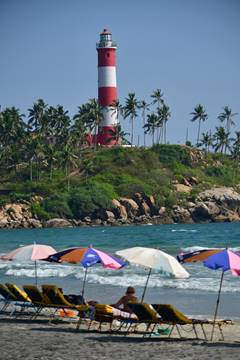We were there at the end of the tourist season with only a few bikini-clad folks left on the beach. Not that I took photos, just of Narda with her umbrella. It used to be a nude beach, I think the only one in India, but then they banned nakedness as perhaps not having clothes on is unnatural for hunters and gathers that we homo sapiens are. After all we were born with clothes on and we should keep them on. At the southern end of Lighthouse Beach is a striped lighthouse with a viewing platform which was closed, we discovered after walking to the end of the beach and up the hill to it. Always a fun thing to do on a hot day. We didn’t make it to the palm-backed beaches of Hawa Beach and Samudra Beach but chose to get the next bus back to the city which thankfully was an air-conditioned bus. It was double the price setting us back 40 rupees (sixty-two cents, USD for the two of us for the hour ride) but well worth it.